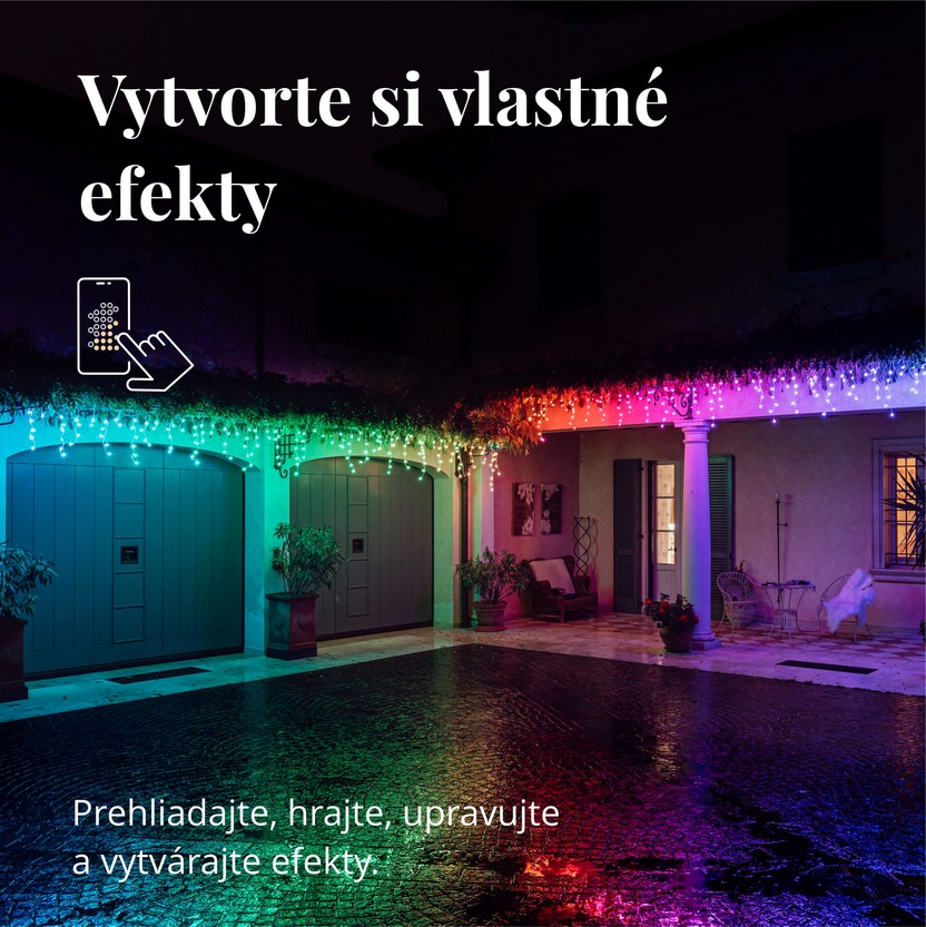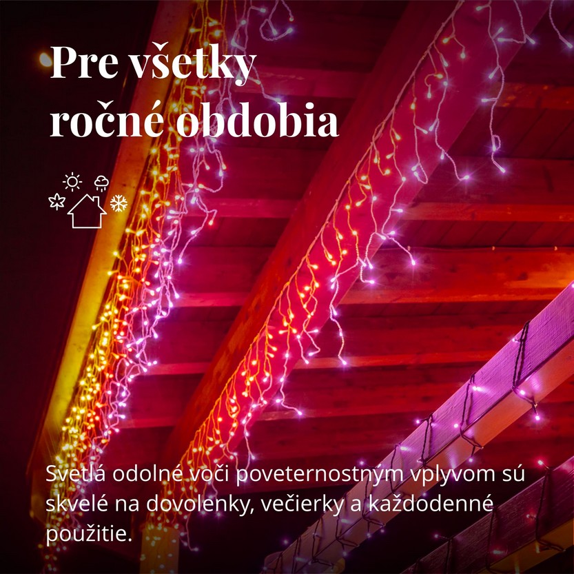 Ta moderna osvetlitev LED v obliki ledenih sveč Twinkly Icicle special edition 5m RGB-AWW 190 LED je namenjena vsem, ki želijo stilsko popestriti svojo božično dekoracijo. Razsvetljava združuje obe vrsti svetlobe, zato je od stranke odvisno, ali želi steno, okno ali teraso razsvetliti v svetlih barvah ali v nežnejših belo-zlatih tonih.
