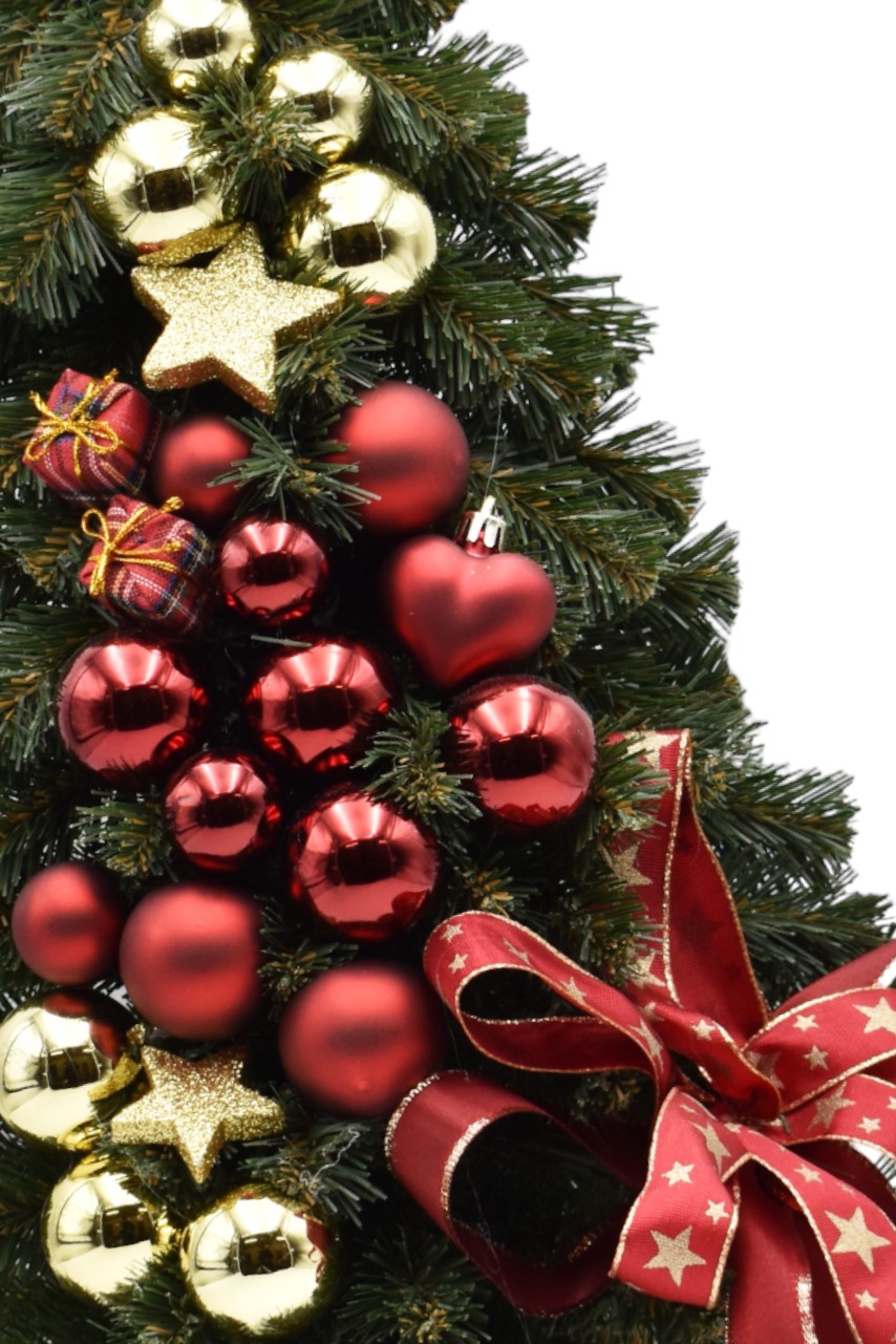 Majhno zlato-rdeče božično drevo predstavlja čudovito dekoracijo za vaš dom. To majhno okrašeno božično drevo vas bo očaralo z naravno zeleno barvo, enakomerno piramidasto obliko iglic in okusno dekoracijo. To majhno drevo lahko uporabite za božično dekoracijo v manjših prostorih in pri njegovem okraševanju ne boste imeli nobenih težav.