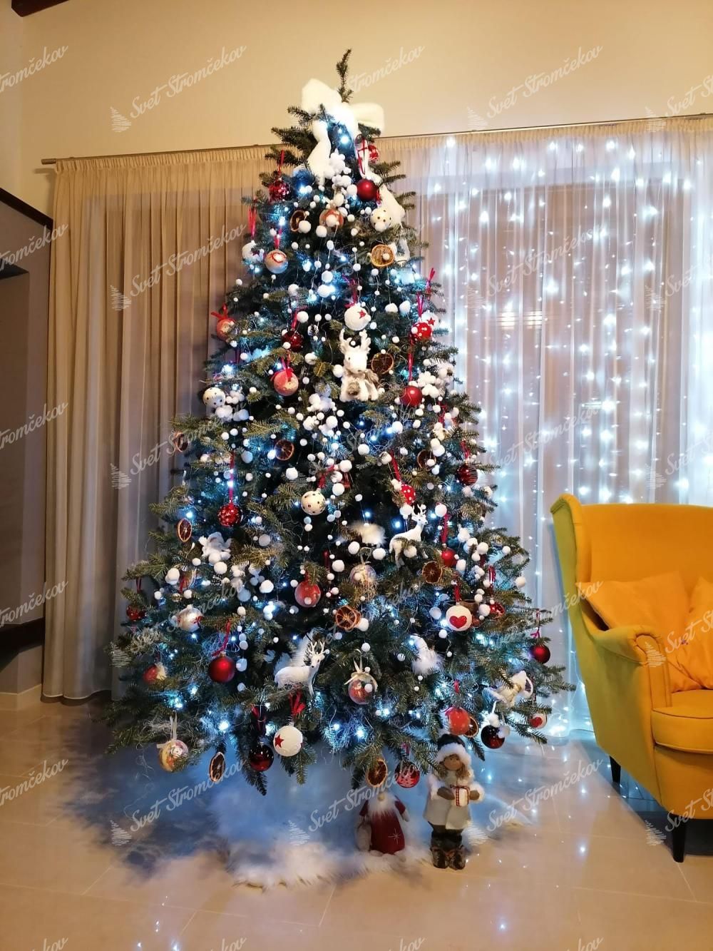 Drevo je na sredini zgoščeno s klasičnimi PVC vejicami, zahvaljujoč temu ima bogat, gost videz. Sistem Dežnikov sistem zlaganja zagotavlja popolno obliko drevesa. Celotno drevo je izdelano iz visokokakovostnih materialov. Stabilno stojalo je del paketa.