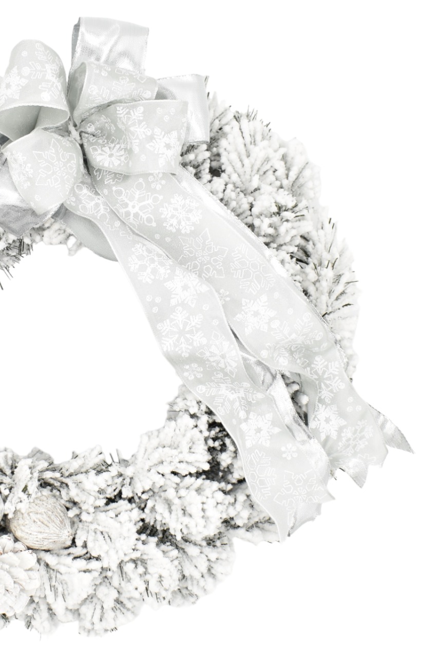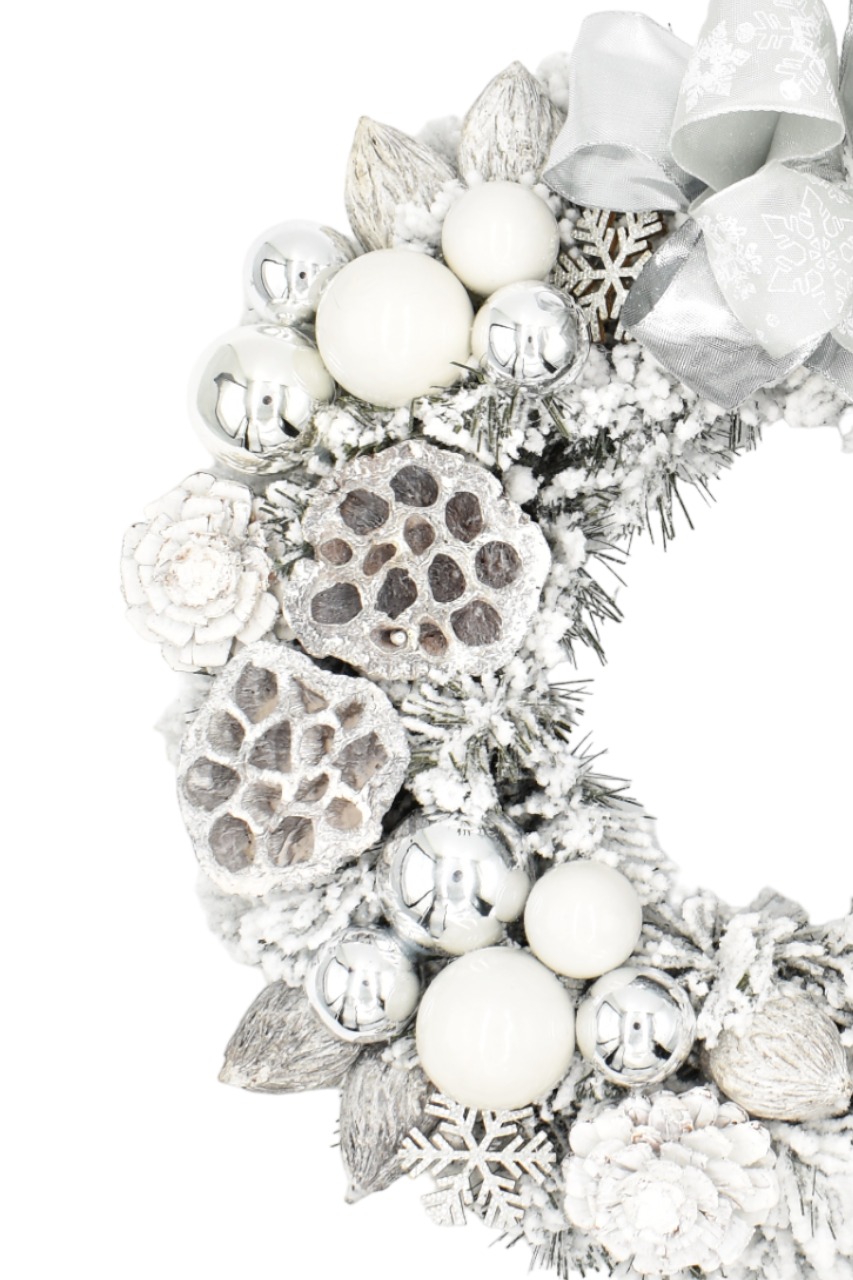 Beli okrasni božični venček z debelo plastjo umetnega snega bo vašo božično dekoracijo pripeljal do popolnosti. Ta božični venček ima debele, bogato zasnežene, kakovostno izdelane PVC iglice, ki jih dopolnjujejo okusni belo-srebrni okraski in velika pentlja.
